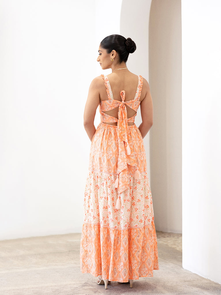 Contrast Fabric Tassel Detailed Back Tie Up Printed Maxi Dress